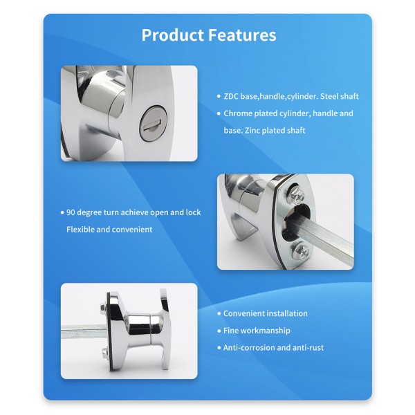 Chrome plated cylinder, handle and base.Zinc plated shaft 90 degree turn achieve open and lock.